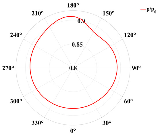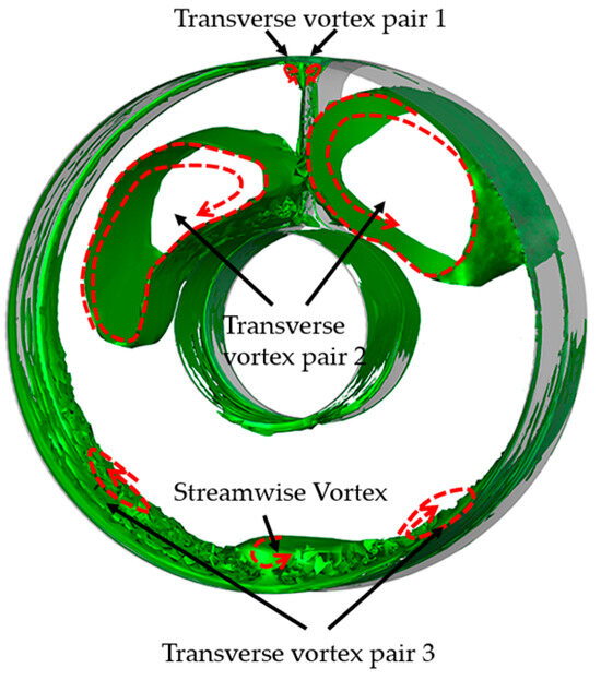 Transverse vortex pair 2’s area of effect gradually expands during its development. Combined with the time-averaged pressure distribution shown on the AIP wall in Figure 14, this result demonstrates that when the fluid near the boundary of transverse vortex pair 2 flows close to the outer wall of the inlet, it encounters adverse pressure gradients in both the 0° to 330° and 30° to 60° directions. Ultimately, transverse vortex pair 3 forms under the driving force of adverse pressure gradients.