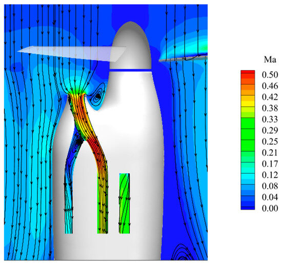 Figure 21 presents the Mach number distribution on the symmetry plane of the inlet under different gust velocities. When the gust velocity is positive, the interaction between the incoming flow and the downwash generated by the rotor causes the downwash flow to shift towards the inlet side of the inlet. As the gust velocity increases, this phenomenon becomes more pronounced. Consequently, a greater downwash flow with higher mechanical energy, located further away from the blade root, is drawn into the inlet under its suction effect. This phenomenon leads to an increase in the total mechanical energy entering the inlet, which is one of the main reasons why the total pressure recovery coefficient increases under positive gust velocities. However, when the gust velocity is negative, a majority of the air entering the intake duct originates from the blade root, with low-energy fluid from the boundary layer diverter also being drawn into the inlet. Consequently, the air drawn into the inlet possesses lower mechanical energy, thereby reducing the total pressure recovery coefficient compared to that under conditions without gusts.