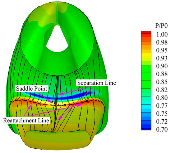 Figure 11 shows the time-averaged Mach number distribution on the symmetry plane of the inlet. External airflow is drawn into the inlet via suction at the entrance. At the bifurcation, the airflow divides into two streams. The majority of the fluid flows into the engine duct to power the engine, while a small portion passes through the scavenge duct to expel foreign objects from the engine. Combined with the wall-limited streamlines on the inlet wall shown in Figure 12, it is further observed that upon entering the inlet, some of the air initially attaches to both sides of the bifurcation, creating a high-pressure zone and reattachment line. Subsequently, the fluid within the boundary layer at the bifurcation converges towards the center under the influence of favorable pressure gradients. Eventually, the fluid meets at the central position, forming a saddle point. Subsequently, the boundary layer initiates detachment from the wall, leading to an interaction with the mainstream flow, inducing flow separation and the formation of a separation line. Eventually, a vortex emerges along the flow direction, depicted as the streamwise vortex in Figure 9. The air within the vortex is then replenished by low-pressure air from the interior of the boundary layer, culminating in the establishment of a low-pressure zone, Zone 1, on the AIP.