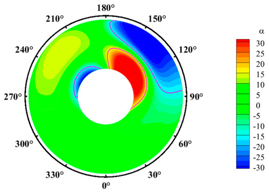 To further investigate the influence of vortices on the performance of the inlet, an analysis of the swirl angle distribution on the AIP was conducted, as shown in Figure 15. Here, regions where || = 15° are marked in purple solid lines. In these regions, areas with larger swirl angles are distributed on both sides above the shaft and on the right side of the inlet wall. Combined with the analysis of secondary streamlines, it can be inferred that these results are due to the presence of transverse vortex pair 2, which induces the rotation of the mainstream fluid, resulting in higher tangential velocities in this region, and, consequently, larger swirl angles.