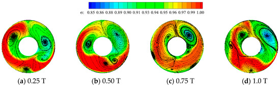 Subsequently, an analysis was conducted to examine the dynamic evolution characteristics of the flow field during the rotation of the rotor. Figure 16 illustrates the total pressure recovery distribution on the AIP and its secondary streamlines at four moments within one period of the rotor’s rotation. Under the effect of the rotor, the pressure distribution on the AIP exhibits pronounced unsteady features. The location and magnitude of low-pressure regions oscillate within a certain range due to the effects of vortices, but the overall trend of the pressure distribution remains similar.