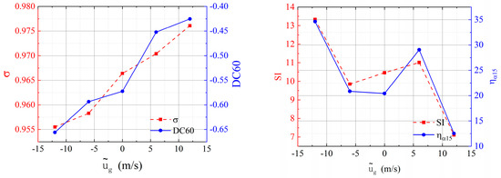 Figure 20 presents the performance variation curve of the tiltrotor aircraft’s inlet under the influence of head-on gusts. Head-on gusts significantly influence the performance of the inlet, causing related performance parameters to exhibit similar trends. As the gust velocity positively increases, the total pressure recovery of the inlet gradually increases by 1.01% when the gust velocity reaches 12 m/s, and the circumferential distortion at the exit decreases by 25.72% when the gust velocity reaches 12 m/s. However, the swirl intensity and area ratio with a swirl angle || greater than 15° initially experience a slow increase before rapidly declining, demonstrating an overall decreasing trend. Ultimately, when the gust velocity reaches 12 m/s, ηα15 decreases by 62.84%, which has a relatively strong effect on the performance of the inlet. However, when the gust velocity increases negatively, the performance parameters exhibit opposite trends. As the gust velocity reverses its increase, the total pressure recovery coefficient of the inlet gradually decreases by 1.13%% when the gust velocity reaches 12 m/s. Then, the circumferential distortion index increases, and η increases by 14.57% when the gust velocity reaches 12 m/s. Both the swirl intensity and the area ratio with a swirl angle || greater than 15° indicate an overall increasing trend. Ultimately, when the gust velocity reaches 12 m/s, ηα15 increases by 69.59%, thereby decreasing inlet performance.