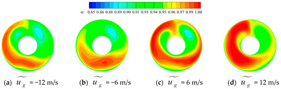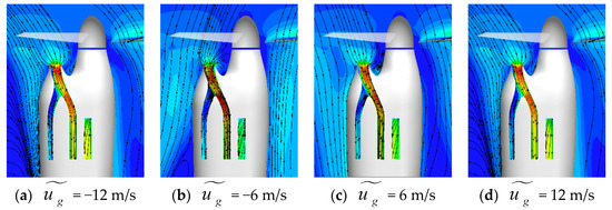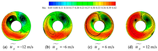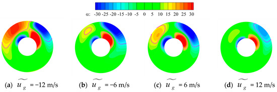 Figure 24 and Figure 25, respectively, present the distribution of secondary streamlines and swirl angles on the AIP of the inlet under different gust velocities. The regions where || = 15° are marked by solid purple lines in Figure 25. Here, gusts also have a significant effect on the swirl angle at the exit of the inlet. In all four gust velocity cases, areas with large swirl angles on the AIP of the inlet are distributed on both sides above the shaft and upper wall of the inlet. Combined with the secondary streamlines, this phenomenon can be analyzed as being induced by the presence of transverse vortex pair 2. Transverse vortex pair 2 redirects the airflow towards the center of the section, resulting in higher tangential velocities in this region, leading to a larger distribution of swirl angles. Due to the influence of gusts, the swirl angle of the AIP continuously changes. Both parameters undergo significant changes as the gust velocity varies. When the gust velocity is positive, the distribution of swirl intensity and the area with swirl angle || > 15° initially increases before decreasing with an increase in wind velocity. However, when the gust velocity is in the opposite direction, the proportion of the area with swirl angle||> 15° increases as the wind velocity increases. The swirl intensity shows a trend of decreasing first and then increasing. Notably, throughout this process, the change in swirl angle is most pronounced in the top left corner. The fundamental reason for this phenomena is that gusts cause significant variations in the size and intensity of transverse vortex pair 2 within the intake duct and alter the magnitude and distribution of the secondary swirl, ultimately leading to changes in the swirl angle.