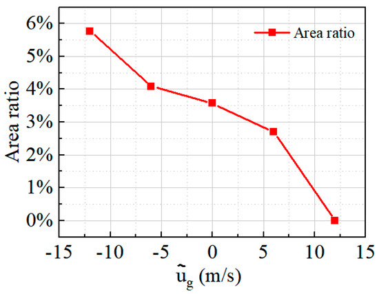 Figure 22 exhibits the total pressure recovery on the AIP under the various gust velocities to better understand how gusts affect the pressure and circumferential distortion on the AIP. The boundaries of areas where the total pressure recovery coefficient equals 0.9 are delineated with solid blue lines. Additionally, Figure 23 illustrates the proportion of the total AIP area with total pressure recovery below 0.9. Clearly, as the gust velocity gradually increases from the positive direction, areas where the total pressure recovery is less than 0.9 are primarily concentrated in Zone 2, which contains the low-pressure region influenced by transverse vortex pair 2. Moreover, as the gust velocity increases positively, the areas with total pressure recovery less than 0.9 gradually decrease. These areas eventually only remain in Zone 2, despite initially being distributed in both Zone 2 and Zone 4. By the time the gust velocity reaches 12 m/s, the areas with total pressure recovery less than 0.9 completely disappear, and pressure distribution across the section becomes increasingly uniform. However, as the gust velocity increases in the negative direction, the areas with total pressure recovery values below 0.9 gradually expand. When the negative gust velocity reaches 12 m/s, Zone 4, which is influenced by transverse vortex pair 2, also presents a significant area with total pressure recovery coefficients below 0.9. This result indicates that head-on gusts primarily influence the total pressure recovery and circumferential distortion index of the inlet by modifying the intensity of transverse vortex pair 2 and the pressure values of the air contained within.