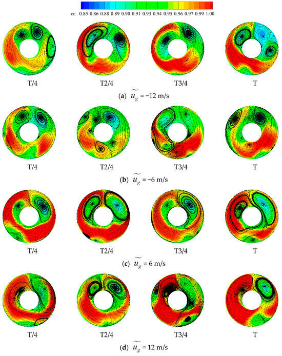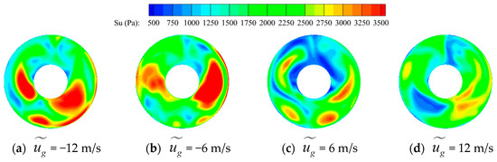 Figure 26 presents pressure and secondary streamline contour maps in four instances within one period for the AIP of the tiltrotor aircraft inlet under various gust velocities. Here, the combined influence of rotor motion and gusts yields significant unsteady characteristics in pressure distribution and vortices on the AIP. When the gust velocity is positive, the largest scale lateral transverse vortex pair on the AIP surface of the intake duct (vortex pair 2) induces a relatively stable low-pressure area. Consequently, the pressure distribution on the AIP exhibits a similar trend. However, the low-pressure area caused by the streamwise vortex undergoes continuous oscillation at the bottom of the AIP surface due to the rotation of the rotor. Thus, regions with significant total pressure fluctuations, as depicted in Figure 27, are mainly concentrated at the bottom of the AIP surface. When the gust velocity is positive, the largest scale transverse vortex pair on the AIP of the inlet (vortex pair 2) induces a relatively stable low-pressure area. Consequently, the pressure distribution on the AIP surface exhibits a similar trend. However, the low-pressure area caused by the streamwise vortex undergoes continuous oscillation at the bottom of the AIP due to the rotation of the rotor. As a result, regions with significant total pressure fluctuations, as depicted in Figure 27, are mainly concentrated at the bottom of the AIP. The proportion of areas with significant total pressure fluctuations near transverse vortex pair 2 is relatively small. Furthermore, as the gust velocity increases, the total pressure on the left side of the AIP becomes more stable. This observation suggests that head-on gusts exert a certain promoting effect on the stability of vortices inside the inlet. Conversely, when the gust velocity is negative, the vortices on the AIP of the inlet undergo violent oscillations under the combined effect of the rotor and gusts, primarily concentrating in the region influenced by lateral transverse vortex pair 2. This phenomenon produces significant total pressure fluctuations on both sides of the shaft, as shown in Figure 27. When the negative gust velocity reaches 12 m/s, the streamwise vortex at the bottom also undergoes violent oscillations, ultimately resulting in areas with significant total pressure fluctuations at the bottom.