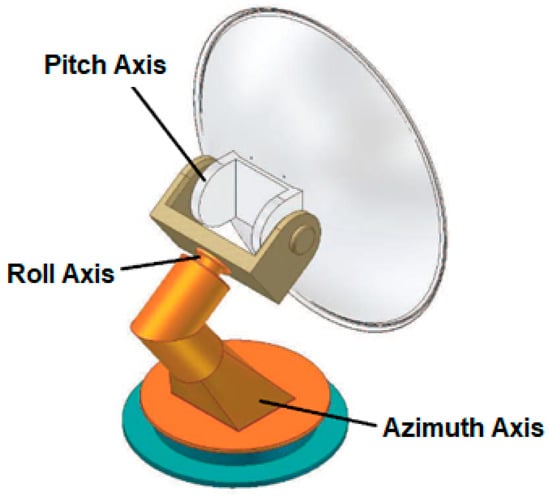 The three-axis SOTM antenna structure under study in this paper is illustrated in Figure 1. The entire system is installed on a fixed base, which is firmly attached to the carrier. Typically, bearings are employed to drive the base unit for rotational movement and mechanical linkage. Figure 2 displays a physical image of a three-axis SOTM antenna manufactured by SATPRO M&C Tech Co., Ltd. (located in Xi’an, China). The three-axis antenna system includes an azimuth sub-system, a roll sub-system and a pitch sub-system. Each of the three sub-systems has a rotating axis, which is used to adjust the antenna attitude, isolate the carrier disturbance and keep the antenna stable. Due to the limitation of the mechanical structure of the SOTM system, there is an angle less than 90° between the roll axis and the system base (generally 30°–35°) []. Brushless DC motors are usually used to drive the movement of each axis through gears or belt drives. The antenna used to transmit and receive satellite signals is installed on the pitch sub-system and moves with the pitch axis. The system uses a high-gain antenna to achieve wideband multimedia satellite communication. When the SOTM antenna tracking satellite error exceeds a certain range, it may interfere with adjacent satellites, causing the antenna to fail to transmit radio frequency signals. Therefore, the antenna pointing fluctuation must be kept within a sufficiently small range []. When measuring the antenna direction, a sensing system with sufficiently high precision and high sampling rate must be selected to quickly and accurately feed location and attitude information to the controller. The controller adjusts the antenna attitude by driving the motor, thereby ensuring that the antenna always points to the target satellite []. During continuous communication with the satellite, the servo system needs to continuously calculate the rotation angles of the three motors.