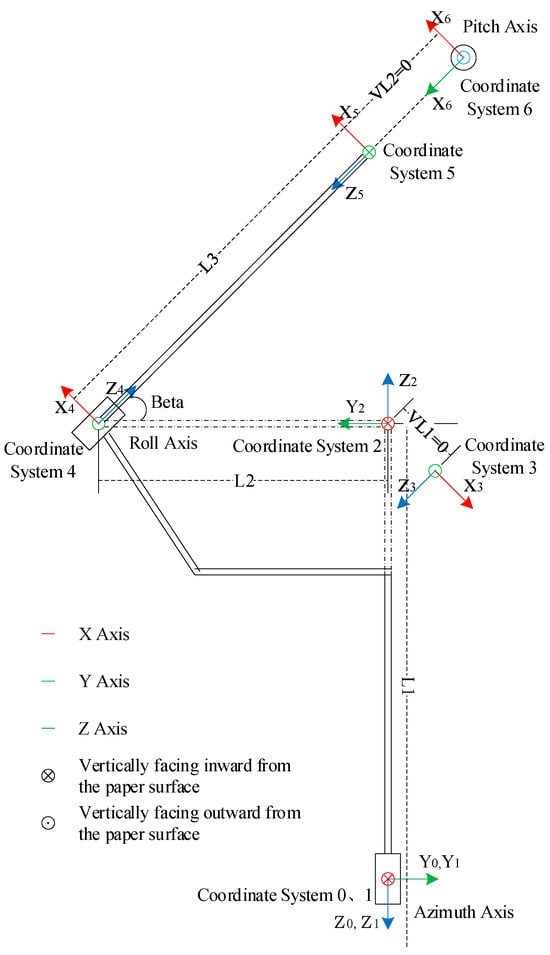 Based on the mechanical structure of the three-axis SOTM antenna, the antenna coordinate system configuration is obtained as shown in Figure 3. Among them, the coordinate system 0 is the reference coordinate system, which is firmly attached to the base. When the rotation angle of the azimuth axis is 0, the coordinate system 1 coincides with the reference coordinate system, the z-axis of the reference coordinate system coincides with the axis of the azimuth axis and represents the azimuth axis. Beta is the fixed angle between the roll axis and the base. The existence of this angle can improve the rigidity of the mechanical structure to improve the mechanical performance of the antenna, but it will increase the difficulty of modeling the antenna kinematic model. Since beta () is a fixed angle, it is difficult to directly use the modified DH method for system modeling. For this reason, a virtual coordinate system 2 is added in the coordinate system shown in Figure 3. In addition, due to the spatial relationship characteristics between and , and in Figure 3, the correct link length cannot be obtained along and respectively. Therefore, auxiliary coordinate system 3 and 5 are added in Figure 3 respectively. In Figure 3, the origins of the virtual coordinate system 2 and the auxiliary coordinate system 3 coincide, and the auxiliary coordinate system 5 and the origins of the coordinate system 6 coincide. In order to make Figure 3 clear, and are set in the figure to represent the two groups of coincident coordinate systems. Coordinate systems 4 and 6 represent the roll and pitch axes, with and denoting the rotation axes of the roll and pitch axes, respectively. This paper refers to the above method as the NMDH method.