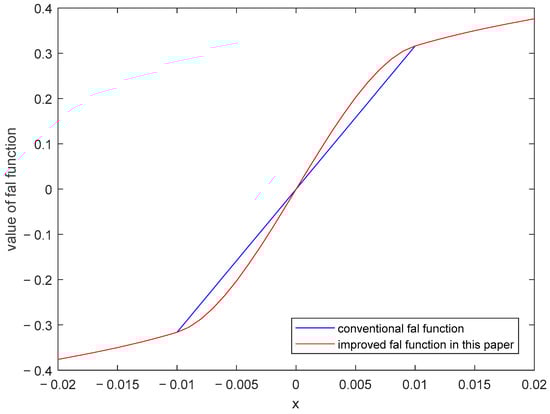 In ADRC, the performance of the extended state observer significantly impacts the control effect of the control system. The control system needs to compensate for the total disturbance, which is observed and estimated by the extended state observer. The function, derived from engineering practice through fitting, does not have a unique form. In ADRC, the function is a continuous function, but it has non-differentiable points, namely at and in Equation (22), where the left and right derivatives of the function are not equal. These points are cusp points, indicating that it is a continuous but non-smooth function. Studies have shown that the continuous smoothness of the function significantly affects the control effect of ADRC []. Thus, the function may adversely affect the control system, there is a need to develop a new function [,,]. Therefore, this paper introduces a new function as presented in Equation (25):