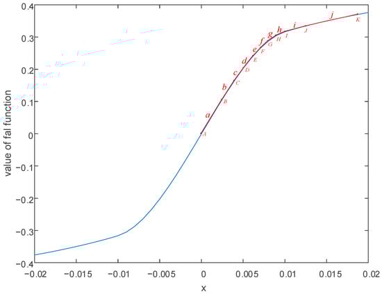 From Figure 6, it can be seen that the line formed by connecting segments , , , closely approximates the curve of the improved function. For the aforementioned piecewise linearization method, it is sufficient to store the parameters of each line and the coordinates of each point locally in the microprocessor to easily compute the improved function. Since the expression for each segment is a linear function, it can be calculated quickly and efficiently to obtain the value of the improved function by microprocessors with hardware floating-point capabilities. This method consumes less computing resources and time for microprocessors. Additionally, as mentioned earlier, since the improved function is symmetrical about the origin, it is only necessary to select points and connect them with line segments either after or before the point of the improved function. The other half can be easily obtained by utilizing the central symmetry property of the improved function, which can reduce the consumption of the microprocessor’s local storage resources to some extent.