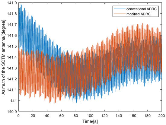 The azimuth orientation of the SOTM antenna when using conventional ADRC and modified ADRC is illustrated in Figure 8. To clarify the curve details and improve the readability of the graphical information, data spanning a continuous 200-s are selected for plotting. From Figure 8, it can be observed that, compared to conventional ADRC, the fluctuation in the azimuth orientation of the SOTM antenna is smaller with the modified ADRC proposed in this paper, indicating that the modified ADRC enables a more precise azimuth orientation of the SOTM antenna.