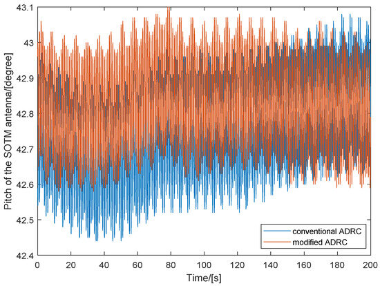 The pitch orientation of the SOTM antenna when using conventional ADRC and modified ADRC is illustrated in Figure 9. Similarly, to clarify the curve details and improve the readability of the graphical information, data spanning a continuous 200-s are selected for plotting. From Figure 9, it can be observed that, compared to conventional ADRC, the fluctuation in the pitch orientation of the SOTM antenna is smaller with the modified ADRC proposed in this paper, indicating that the modified ADRC enables a more precise pitch orientation of the SOTM antenna.