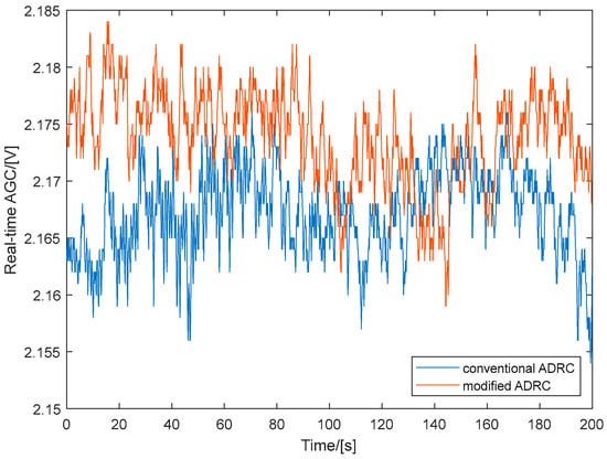 The AGC levels of the SOTM antenna when using conventional ADRC and modified ADRC are illustrated in Figure 10. Similarly, to clarify the curve details and improve the readability of the graphical information, data spanning a continuous 200-s are selected for plotting. From Figure 10, it can be observed that, compared to conventional ADRC, the AGC levels are higher with modified ADRC proposed in this paper. This indicates that the communication performance of the SOTM antenna is better with the modified ADRC.