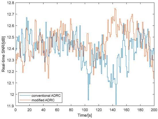 The SNR of the SOTM antenna when using conventional ADRC and modified ADRC is illustrated in Figure 11. Similarly, to clarify the curve details and improve the readability of the graphical information, data spanning a continuous 200-s are selected for plotting. From Figure 11, it can be observed that, compared to conventional ADRC, the SNR values are higher with the modified ADRC proposed in this paper. This indicates that the communication performance of the SOTM antenna is better with the modified ADRC.
