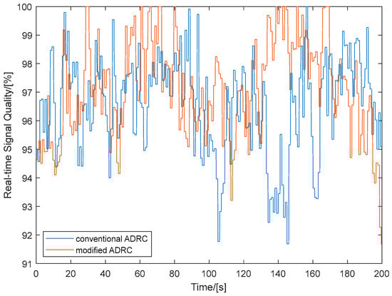 The signal quality of the SOTM antenna when using conventional ADRC and modified ADRC is illustrated in Figure 12. Similarly, to clarify the curve details and improve the readability of the graphical information, data spanning a continuous 200-s are selected for plotting. From Figure 12, it can be observed that, compared to conventional ADRC, the signal quality values are higher with the modified ADRC proposed in this paper. This indicates that the communication performance of the SOTM antenna is better with the modified ADRC.
