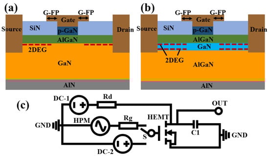 Electromagnetic environmental effects at the aircraft’s whole and equipment levels have been studied by a large number of teams [11,12], but the chips inside equipment are equally one of the core problems that cause the failure of aircraft. In this paper, the p-GaN gate cap structure is used to realize enhanced HEMT devices, due to its excellent aero-material properties. Currently, while numerous teams are devoting efforts to the research of device processes and structural characteristics, the impact of high-power microwaves on devices is often overlooked. For instance, as mentioned in reference [13], doping magnesium (Mg) into the p-GaN gate cap layer has been employed to improve the instability of the device threshold voltage. However, achieving the desired p-type conductivity requires a significant amount of Mg doping, which may introduce excessive defects and impurities, thereby affecting the migration properties and thermal stability of the device. Reference [14] proposed a novel analytical model by incorporating a half-bridge structure. Nevertheless, this structure renders the performance of GaN devices highly susceptible to temperature variations, thus reducing stability. To date, the impact of these experimental devices under high-voltage or high-power microwave conditions has not been taken into account. Consequently, research on the combination of p-GaN HEMT and electromagnetic environmental effects holds significant importance in this context. Among contemporary device materials, silicon carbide (SiC) is renowned for its exceptional breakdown electric field (3.0 MV· cm−1) and radiation resistance (1 × 109–10 rad), stemming from its stable composite crystal structure, which stands out in areas such as breakdown characteristics, high frequency, and radiation resistance [15]. Nevertheless, despite SiC devices’ outstanding performance in numerous aspects, gallium nitride (GaN) devices have been found to exhibit superior characteristics, boasting a breakdown electric field approximately 1.2-times higher and a radiation resistance nearly 10-times greater than SiC devices [16].