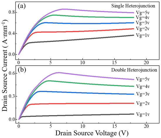To make a device work efficiently in a high-frequency environment, some researchers have adopted methods such as varying gate length or incorporating field plate structures. However, this approach can lead to an increase in input capacitance, exacerbated current collapse effects, short-channel effects, and other issues [17,18]. Additionally, some scholars have performed special treatments on the surface of HEMTs to enhance the breakdown performance of the device. Nevertheless, an improper treatment may result in the introduction of new surface states and defects [19]. Based on these issues, the above problems can be effectively avoided by double heterojunction devices, allowing better high-frequency devices [20,21].