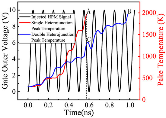 The commonly used X communication band was selected as the injected microwave signal. A single-pole, double-branch switch (S) at the gate of the device was connected to the HPM signal source, and the circuit was energized. The HPM signal source was set to continuously inject 10 GHz, 47 dBm high-power microwaves of similar sinusoidal form at the gate. Reproducibility verification was conducted multiple times, and the results were consistent. The HPM injection signal shape is given in Figure 3. In addition, when the internal temperature of the HEMT device reached 1975 K, the lowest melting point of GaN material, this was used as the basis for judging that thermal breakdown had occurred in the device. Extracting the simulation results, point A (0.5776 ns) was the breakdown moment of the single heterojunction HEMT device; point B (0.9831 ns) was the breakdown moment of the double heterojunction HEMT device; and point C and point B were the same moment, which was the comparison point of the double heterojunction HEMT device. The variation in the peak temperature inside the device with time is shown in Figure 3, where the peak temperature rise of the device was accelerated when the injected HPM signal was high, and the peak temperature rise of the device was slowed down when the injected HPM signal was low. The internal peak temperature and the injected signal changed at the same frequency. This was determined by the speed of the electrons injected by the HPM versus the rate of transfer of electrons within the device. The rate of the former was much greater than the rate of the latter; therefore, energy was accumulated and the device eventually broke down. Compared to single heterojunction HEMT devices, double heterojunction HEMT devices had a slower temperature rise, longer breakdown time, and greater resistance to breakdown.