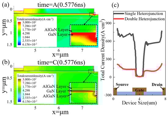 The current density was taken as the best representation of the intensity of current flow, which directly affects the speed and distribution of carrier motion and hence the migration characteristics of a semiconductor. Figure 4 shows the local distribution of current density inside the two devices at moments A and B. Compared to the 2DGE characteristics of the single heterojunction device in Figure 4a, the carriers in Figure 4b are concentrated in the GaN channel layer, with a more pronounced gradient distribution with the buffer layer. Moreover, the diffusion current near the p-gate was reduced. This was due to the fact that the AlGaN/GaN/AlGaN double heterojunction formed unique quantum wells that confined the carriers to move near the inner surfaces of the top and bottom sides of the channel layer. The distribution of current densities at the channel locations of the two devices was investigated and obtained as shown in Figure 4c. The current density distribution of the double heterojunction was more uniform and stable, which was owing to the motion speed and distribution of the carriers being directly affected by the magnitude of the current density, and hence the mean free path of the carriers was affected. On both sides of the gate, the current density in the channel of the double heterojunction device was lower, the mean free path was smaller, and the stability of the device transmission performance was enhanced. Subsequently, the mean free path of the carriers was raised, and the device began to be affected by the hot electron emission current. Since the hot electron emission current density was positively correlated with temperature and independent of the applied voltage [22], accelerating the increase in the device temperature, this was more likely to cause a breakdown. Therefore, the high domain-limiting characteristics of the double heterojunction permitted the electron injection efficiency to be increased, the transport efficiency to be improved, and the leakage current to be reduced. Therefore, the switching characteristics, breakdown characteristics, and stability of the device were improved.