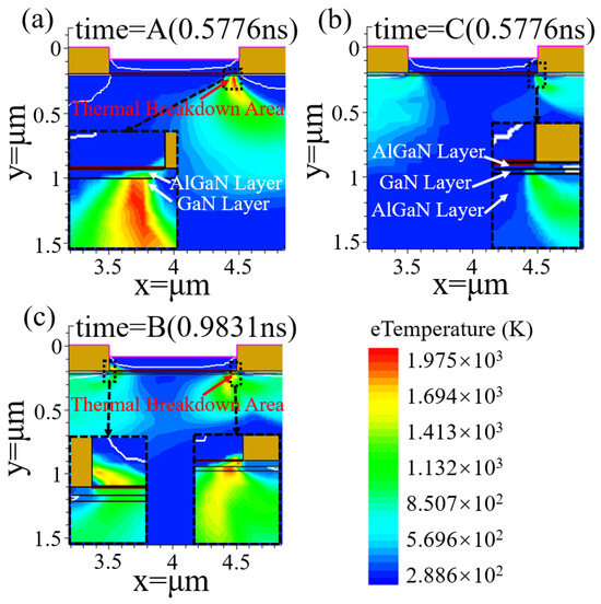 The thermal instability was caused by the structural defects at the column faces of the p-gate junction, such that the heat generated around it was continuously absorbed in each signal cycle. Due to the short pulse width and fast frequency of the input HPM signal, the conduction of the internal temperature of the device to the surroundings was less than the rate of heat generation, and the thermal accumulation effect was caused by the repetition of pulses [24]. As shown in Figure 5a, inside the single-heterojunction HEMT, the thermal breakdown occurred at the column surface of the right junction of the p-gate and the upper region of the GaN buffer layer at moment A (0.5776 ns). Inside the double heterojunction HEMT in the same period, the heat was dispersed equally on both sides of the gate (Figure 5b). The temperature at this point was gently increased until breakdown (B(0.9831 ns) moment), which occurred at the column surface of the right junction of the p-gate, and in the region around the channel. At the same time, the column surface of the left junction reached the critical threshold for breakdown (Figure 5c). In summary, the double heterojunction could effectively inhibit the 2DEG in the channel from being spilled into the buffer layer, the internal temperature distribution of the device was improved, which enhanced the breakdown characteristics of the device. In addition, the area near the carrier channel below the p-GaN HEMT gate is one of the most fragile and breakdown-prone parts of the device.