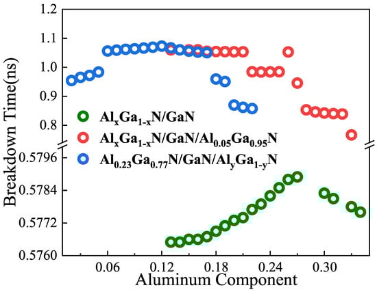 The energy bands and migration characteristics of the device were altered by the Al component in the AlGaN/GaN structure and hence the breakdown characteristics of the device were affected [25]. In this paper, the effect of the percentage of Al component in single heterojunction AlxGa1−xN/GaN and double heterojunction AlxGa1−xN/GaN/AlyGa1−yN on the breakdown characteristics of the devices was investigated. As can be seen in Figure 6, the Al component in the barrier layer (x between 0.13 and 0.34) and the Al component in the buffer layer (y between 0.02 and 0.22) were separately selected for the study. As the single heterojunction device AlxGa1−xN/GaN (parameter x) and the double heterojunction device Al0.23Ga0.77N/GaN/AlyGa1−yN (parameter y) were increased, the breakdown time also increased and the breakdown resistance of the device improved. This was due to the fact that increasing the Al component increased the bandgap, which resulted in the breakdown characteristics and thermal stability of the device being improved. When the Al component was increased to a certain value, the Al component continued to increase, the barrier width of AlGaN/GaN was reduced, the quantum confinement effect was enhanced, and the high-energy electrons more easily jumped to the conduction band, which in turn reduced the barrier height and decreased the breakdown voltage. The reason for this lies in the alteration of the band structure caused by quantum confinement, resulting in the bending and splitting of energy bands along the confinement axis. Consequently, this alteration had a profound impact on the effective mass of the charge carriers. The confinement of charge carrier motion depicted in Figure 4 further corroborates the influence of quantum confinement on the effective mass. Ultimately, this influence gave rise to a wave function for charge carriers that was discontinuous and non-uniform along the confinement direction. The quantum confinement effect was enhanced due to the domain-limited characteristics of the double heterojunction. This led to the breakdown time of the double heterojunction device AlxGa1−xN/GaN/Al0.02Ga0.98N (x-parameter) being rapidly decreased. Therefore, the breakdown voltage was effectively increased when the Al component was moderately increased. Moreover, compared to the single heterojunction device, the double heterojunction Al component was more sensitive and the breakdown was affected more drastically. Precise control of the Al component doping was achieved by optimizing the doping process parameters, ensuring that the Al component occupied the optimal proportion, and maximizing the breakdown performance of the device. Additionally, the structural parameters of the barrier layer were controlled to ensure a reasonable electric field distribution.