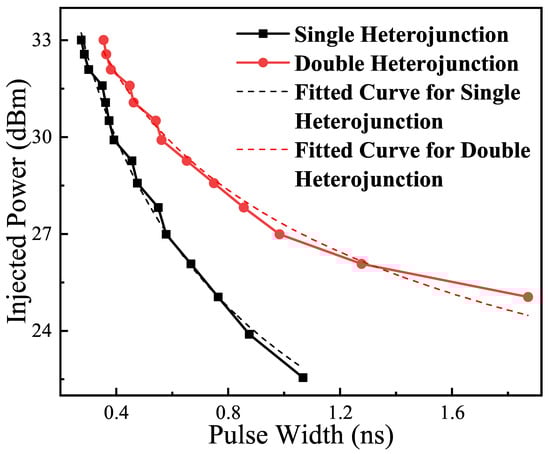 Electromagnetic sensitivity (EMS) has been used as a metric for resistance to electromagnetic interference, which has a reliable value impact on the study of electromagnetic damage in HEMT devices. Since frequency and pulse width are inverse to each other, the relationship between the power damage threshold and pulse width was investigated for both single heterojunction and double heterojunction devices to obtain the damage threshold curves in Figure 7. While maintaining a constant pulse width, this study examined the damage effects of different power signals on the device. The traditional research method is to characterize the device as a spherical heat source model [26]; therefore, the damage energy of the device is considered as a constant value. Nevertheless, a new method was used in the literature [27,28,29] to derive a specific value for the variation. The prediction formula for damage was obtained: