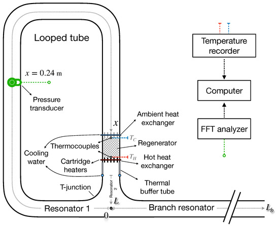Figure 1 presents a schematic diagram of the experimental setup for the present study. This experimental setup was aimed to investigate subcritical bifurcation behaviors for a thermoacoustic Stirling engine, featuring a looped tube and a branch resonator made from a 0.03-m-inner diameter stainless-steel cylindrical pipe. The loop has an average length of m, with the branch resonator of 1.875 m opened to the atmosphere, operating with air at atmospheric pressure. The looped section includes various components: resonator tube 1, a cold heat exchanger, a stacked-screen regenerator, a hot heat exchanger, a thermal buffer tube, and resonator tube 2, arranged along the axial coordinate x from the T-junction. The 20 mm long regenerator comprises stainless-steel woven mesh screens of # 30 mesh number, with a wire diameter of 0.22 mm, hydraulic diameter of 0.82 mm, and a volume porosity of 0.79.
