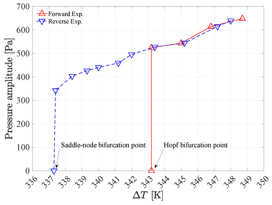 Within thermoacoustic engines, both supercritical and subcritical Hopf bifurcations are observed [3]. An increase in the temperature gradient results in a supercritical Hopf bifurcation, leading to a gradual increase in oscillation amplitude, whereas a subcritical Hopf bifurcation causes an abrupt amplitude jump at the Hopf point, where the system’s stable steady-state becomes unstable and a stable limit cycle emerges. Subcritical cases have been extensively documented across various thermoacoustic engine configurations, including standing wave, traveling wave, phase change, and free-piston Stirling types [3,4,5,6,7,8,9,10,11]. Furthermore, a decrease in the temperature gradient reveals hysteresis in oscillation amplitude with subcritical Hopf bifurcations, eventually ceasing through a saddle-node bifurcation at a distinct fold point [2], which signifies the minimum temperature gradient necessary for engine operation.