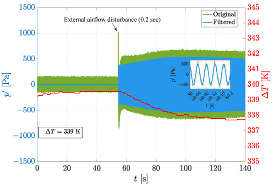 Within the region delimited by the saddle-node and Hopf points, commonly referred to as the “bistability region”, we set steady before thermoacoustic oscillations to explore Landau constants, aiming to investigate the potential for empirical modeling. This exploration includes acknowledging the variations in temperature differences once oscillations are initiated, which arise due to the axial heat transfer caused by acoustic pumping [32], and can impact the attainment of saturated steady-state pressure amplitudes and steady temperature differences in the system. Within this bistability region, Figure 3 illustrates the triggering of original self-sustained pressure oscillations by external airflow disturbances and bandpass-filtered mainly oscillating with 23 Hz. Notably, the filtered excludes the pulse resulting from external disturbances, and its clear wavefront, as depicted in the inlet of Figure 3, enables us to pursue further investigations. Capitalizing on this, we utilize least-squares fits with the Stuart–Landau model to determine Landau constants.