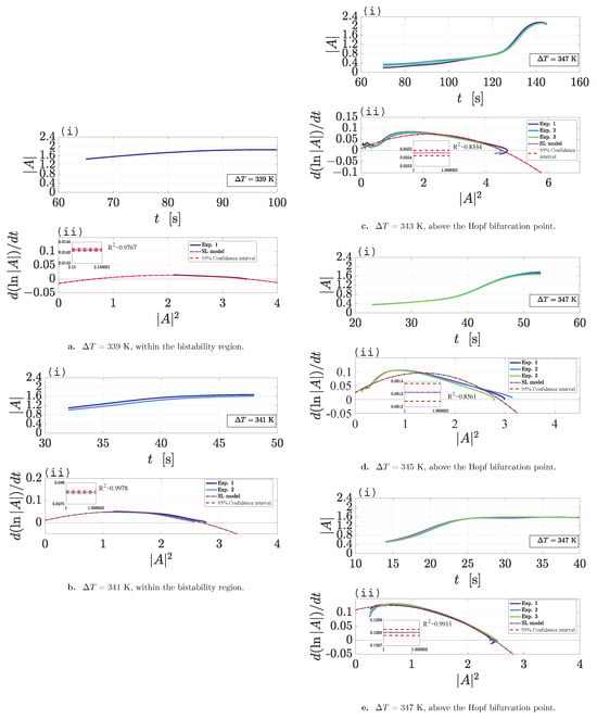 We examine the evolution of pressure oscillations at specific temperature differences: within the bistability region at 339 K and 341 K, and above the Hopf bifurcation point at 343 K, 345 K, and 347 K. These conditions are set to explore the system’s response in thermally steady states before the initiation of oscillations. The experiments were replicated up to three times to ensure reliability. The analysis employs Hilbert transform techniques to reveal the nonlinear transition characteristics of the normalized pressure oscillations . These transitions are categorized into subfigures of Figure 4 for clear comparison: Figure 4a,b represent the conditions within the bistability region at 339 K and 341 K, respectively; while Figure 4c–e correspond to conditions above the Hopf bifurcation point at 343 K, 345 K, and 347 K, respectively. Each subfigure consists of two parts: (i) traces the evolution of the normalized instantaneous amplitudes from their initiation to the maximum amplitude phase, and (ii) displays the corresponding growth rates versus .