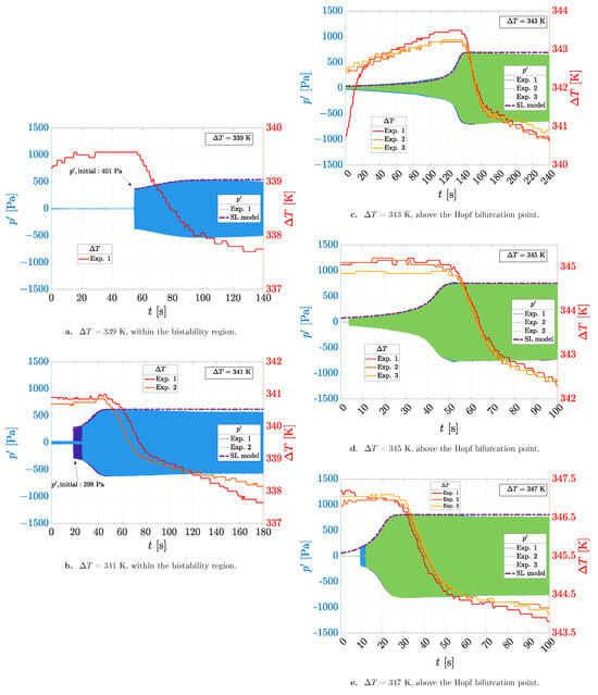 Within the bistability region at K and 341 K, we utilized the initial experimental pressure amplitude as the initial condition for solving the Landau model described by Equation (6). The close alignment between the numerical solutions and experimental data validates the Landau model’s capability to accurately capture the essence of self-sustained pressure oscillations. For scenarios above the Hopf bifurcation point, specifically at 343 K, 345 K, and 347 K, the model was solved using minimal initial amplitudes. It effectively captures the system’s transition into a state of increased nonlinearity, evidenced by the growth in oscillation amplitudes. This phase is marked by augmented amplitudes and clear periodic patterns. Despite slight variances in transient phases between the model’s predictions and experimental findings, the critical aspects, such as the trend and periodicity of the oscillations, are precisely depicted. The slight discrepancies observed are likely due to the system’s inherent nonlinearity, which suggests the need for incorporating terms beyond quintic in the Stuart–Landau Equation for accurately modeling the transient phase. However, the current model up to quintic terms suffices for depicting the saturated amplitude.