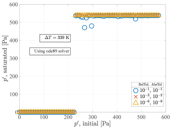 Also, to further validate our model’s accuracy in depicting bifurcation behavior, we conducted numerical calculations using Equation (6) under varying initial conditions within the bistable region at K. Figure 6 illustrates the system’s responses, calculated using the ode89 solver by varying sets of the relative error RelTol and AbsTol. The results demonstrate consistent finite amplitudes or stable states (no oscillation) across different initial conditions of pressure when setting smaller error tolerances, thereby reinforcing the robustness and reliability of our approach in modeling the critical dynamics of thermoacoustic systems. These findings clarified the potential impacts of initial conditions on the numerical integrations and highlighted the necessity of rigorous numerical methods to ensure accurate empirical modeling. This convinces us of the empirical modeling approach’s effectiveness in capturing the dynamics of the system near critical thresholds.