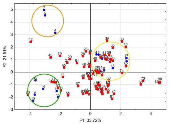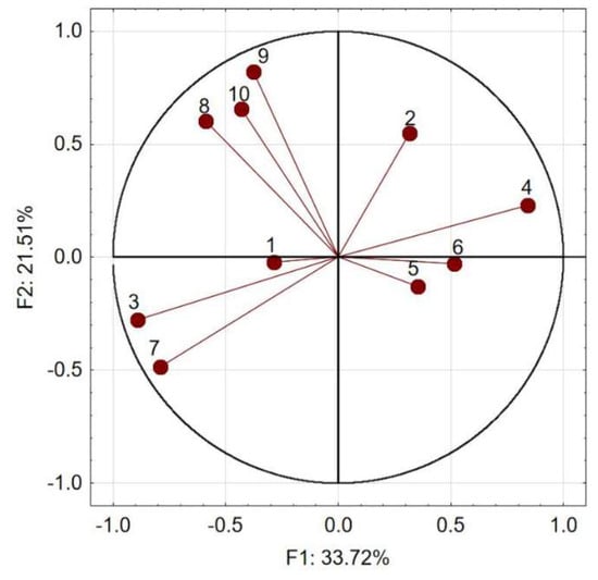 PCA projection of variables set in 2D-factor-loading space (variable designations and chemical assignments are shown in Table 4).