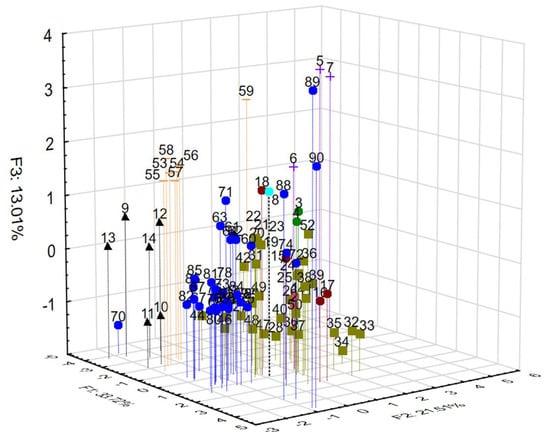 A two-factor analysis showed that the highland and border-region lunar samples differed significantly from the mare samples. The samples from highlands were characterized by relatively high amounts of Al2O3 and CaO and low amounts of TiO2 and FeO (variables 3, 7, 2, and 4, respectively; see Table 4 and Figure 4). The specimens from mares varied, forming only a loose cluster of points with some significant outliers (e.g., samples 42, 70, 89, and 90). To obtain more definite outcomes, the authors decided to conduct a PCA in three-dimensional space. A PCA performed in 3D space (factor scores F1, F2, and F3) makes it possible to obtain more detailed information about differences between cases than is possible using a 2D analysis. The resulting PCA plot in 3D space for factors F1, F2, and F3 is presented in Figure 5.