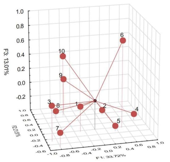 In Figure 6, the PCA distribution of the variables set in 3D-factor-loading space is presented. The variables that most heavily influence the distribution of the samples along the F3 axis are 6 (MgO), 10 (P2O5), and 2 (TiO2).