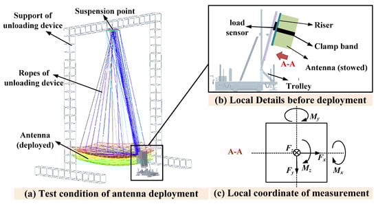 A large-scale truss antenna like Figure 1a is studied in this paper. The design parameters of the antenna are consistent with Ref. []. A zero-gravity unloading device, composed of a support and ropes, was required during the deployment of the antenna. This support is a truss structure and its height is about twice that of the antenna aperture. The antenna hinges and the suspension point of the support were connected by the ropes to compensate the gravity effect of the truss antenna. Before deployment, the antenna was installed on the trolley through the riser with the same oblique angle as when deployed in orbit, and a six-direction load measurement sensor was installed between the riser and the trolley, as shown in Figure 1b. The shock data, obtained by the load measurement sensor, are shown in the local coordinate of Figure 1c. After the pyro devices on the clamp band initiated, the antenna began deploying. Then, the mass center of the antenna performed a circular motion centered on the suspension point of the unloading device. This made the measured shock loads not only include constant values for balancing gravity, but also include centrifugal forces caused by the circular motion, in which the latter led to some errors between the tested and in-orbit shock loads.