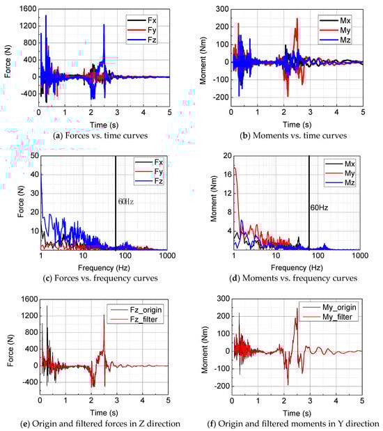 In order to further investigate the shock loads of antenna deployment, fast Fourier transform was performed on the time-domain shock loads, as shown in Figure 2c,d. It can be found that the shock loads below 60 Hz are obviously larger than those over 60 Hz. Through the comparison of the shock loads without and with a low-pass filter of 60 Hz in Figure 2e,f, it can be seen that the filtered curves obviously reduce in the first stage but retain the mechanical shock loads in the third stage. Thus, it can be inferred that the mechanical and pyro shock loads are dominant in less and more than 60 Hz, respectively, and the front one is larger than the latter.