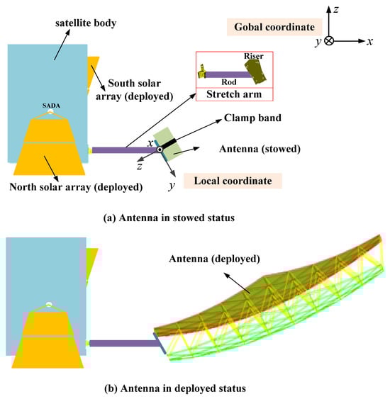 The deployment process of the truss antenna on a satellite with two flexible solar arrays was studied here, as shown in Figure 3. The two solar arrays were equipped on the ± Y sides of the satellite by solar array drive assemblies (SADAs), while the antenna was fixed on the riser of the stretch arm and the arm was fixed on the + X sides of the satellite. There are two solar panels in each solar array, and the detailed parameters of the solar panel are consistent with Ref. []. Before the deployment of the antenna began, the solar arrays and stretch arm were deployed to the specific position. After the initiation of pyro devices on the clamp band, the antenna was driven by spring internal energy from stowed to deployed statuses. The satellite angle and angular velocity were measured by the star sensor and gyroscope, respectively, and the data were downloaded to the ground by the telemetry, tracking and control (TT&C) subsystem of the satellite. There are designs of the global coordinate and local coordinate shown in Figure 3, in which the latter, consistent with that in Figure 1c, was only used to describe the shock loads and all other data in this paper were defined in the front one.