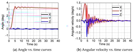 The angle and angular velocity vs. time curves of the satellite during the deployment of the antenna in the global coordinate of Figure 3 were obtained by the telemetry subsystem, as shown in Figure 4. Note that those curves are shown within 40 s from the antenna deployment, and the satellite has not started attitude intervention in this period. It can be found that both the angle and the angular velocity quickly increase within 5 s, which is consistent with the deployment time of the antenna itself. From 5 s to 40 s, the angular velocity gradually vibrantly decays to zero while the angle becomes a constant value due to conservation of the angular momentum. So, it is inferred that shock loads from the antenna deployment inevitably cause satellite attitude changes and solar array vibration, thereby extending the stability time. In addition, the maximum values of the angle and angular velocity are in the Y direction, middle values are in the Z direction, and the minimum values are in the X direction. This is because the maximum shock force is in the Z direction of the local coordinate, forming the maximum torque in the Y direction of the global coordinate. Similarly, the Y-direction angle and angular velocity are from the maximum shock moment in the Y direction of the local coordinate.