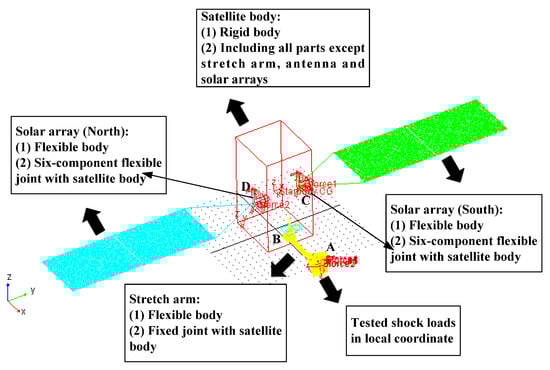 The dynamical model of the satellite was established in ADAMS software [] to simulate the deployment of the truss antenna, as shown in Figure 5. The antenna deployment was equivalent to the shock loads tested in Figure 2a,b, as shown in the red zones at A in Figure 5, due to the complexity of the accurate deployment model of the antenna with many constituent units. The two solar arrays, the stretch arm and the antenna were modelled as flexible bodies, while the satellite body involving all the remaining parts was simulated as a rigid body, as the natural frequency of the latter is two orders of magnitude larger than that of the front one. The stretch arm was fixed with the satellite body. The SADAs between the solar arrays and the satellite body were simulated by six-direction flexible joints like the red zones at C and D in Figure 5, with the equation as follows: