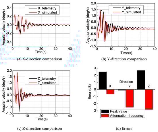 The telemetry and simulated angular velocity vs. time curves of the satellite during the deployment of the antenna in the global coordinates of Figure 3 are compared in Figure 6a–c. It can be found that the simulated angular velocities have more vibration and slightly larger peak values than telemetry values within 5 s, which may be because the telemetry acquisition interval of satellite angular velocities is only 0.5 s, and it is difficult to capture the rapid changes in satellite attitude during the antenna deployment phase. In addition, simulated Y-direction angular velocities attenuate to non-zero constants, as the shock loads used in the model include centrifugal forces caused by the unloading device, causing non-conservation of the angular momentum in this direction. The non-zero constant of about −0.1°/s is obviously smaller than the peak values of angular velocities induced by the antenna deployment, so the simulated method of antenna deployment equivalent to the shock loads tested was thought to be efficient. In addition, Figure 6d shows the simulated errors in terms of the peak values and attenuation frequency, in which an error is equal to 20 × lg(simulated value/telemetry value). It can be seen that all the errors are within 3 dB; thus, the model was thought to be efficient.