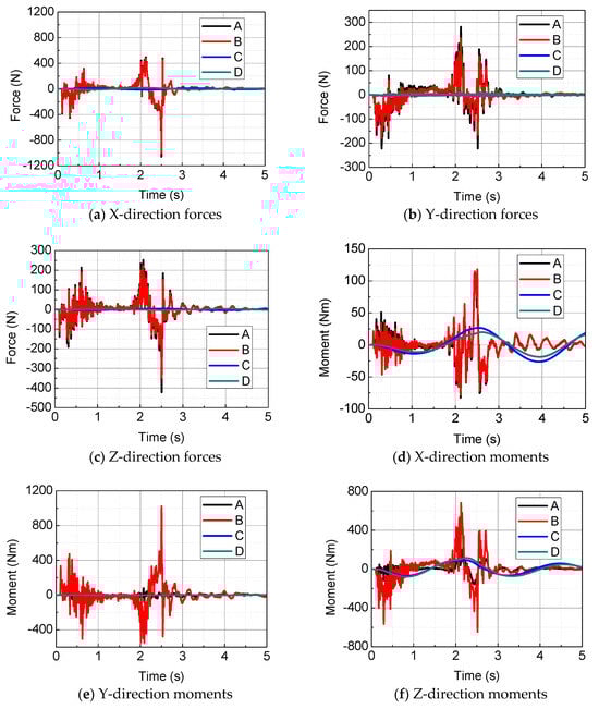 The loads at four typical locations in the global coordinates of Figure 3 are compared in Figure 7. It can be found that the three direction forces and the X-direction moment from Point A to Point B are basically unchanged, while the moments in the Y and Z directions increase significantly. This is because the moments in the Y and Z directions at Point B include the bending moments formed by the forces at Point A, and the X-direction force at Point A cannot form the accumulated moment for the X-direction moment at Point B. The forces and moments at Point B drive the attitude rotation and position translation of the satellite body, forming the loads at Points C and D. It can be indicated that all the forces and Y-direction moments at the two points are quite small, while the X-direction and Z-direction moments are obviously greater. This is because the stiffness and damping coefficients of SADAs in the X and Z rotational directions are at least one order of magnitude larger than those in the Y rotational direction. Therefore, the shock-induced moments, except the SADA rotation direction, should be highlighted for the deployment dynamic design of satellites with multiple large flexible appendages.