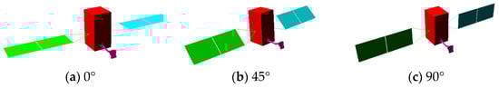 In order to obtain the satellite strategy during the truss antenna deployment to protect the SADAs and solar arrays, the effect of the solar array attitude was discussed, including 0°, 45° and 90° attitudes, as shown in Figure 8. Note that the solar arrays do not rotate for their own service during antenna deployment.
