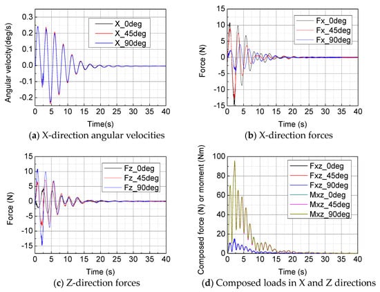 Only the X-direction attitudes of the satellite as well as the X-direction and Z-direction loads at the SADAs with different solar array attitudes are shown in Figure 9, due to the similar rules in the other directions. It can be seen that the solar array attitude has few effects on the angular velocities of the satellite in the three directions and the Y-direction loads at the SADAs. Meanwhile, it affects the X-direction and Z-direction loads at the SADAs but did not composed loads of them. Therefore, it can be inferred that the solar array attitude has few effects on the shock-induced loads at the SADAs and there is no need to pay special attention to the design of the solar array attitude during antenna deployment.