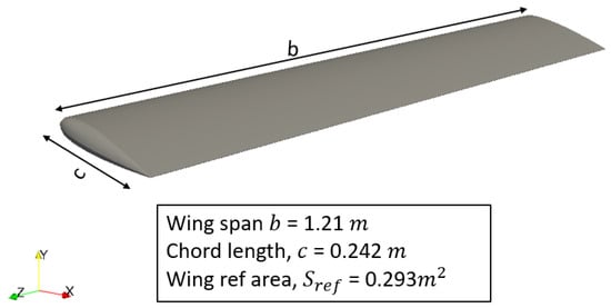 A NACA 0018 finite-aspect-ratio wing with was made up from the two-dimensional NACA 0018 section profile with rounded tips at its ends. The wing span of the NACA 0018 was measured as m, and the chord length was m. A blunt trailing edge similar to that in the wind tunnel wing geometry was implemented. The incorporation of rounded tips aimed to facilitate smooth flow attachment to the wing edges and support the proper development of wing tip vortices. The adopted geometry of the considered wing is illustrated in Figure 1. The boundaries of the virtual wind tunnel were positioned at a distance of 50 chord lengths in the upstream, downstream, and sideways directions. Consequently, there was no need for blockage corrections in the Computational Fluid Dynamics (CFD) results obtained with this setup.