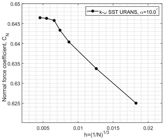 Normal force coefficient () variation against grid resolution parameter (h) from the conducted mesh independence study.