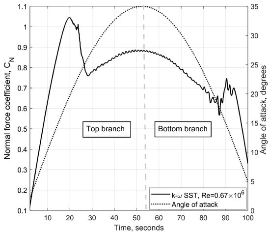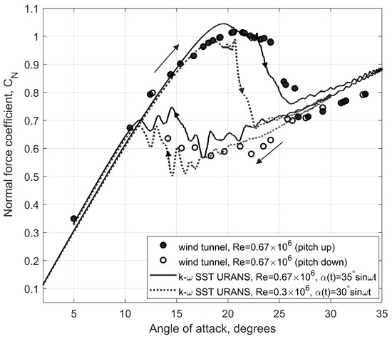 During the pitch-down motion, the CFD results demonstrate significantly lower values for the same angle of attack (), which is identical to the wind tunnel data. The maximum difference in between the top and bottom branches occurs at , where and , leading to a noticeable drop in the normal force coefficient: . The static hysteresis loop obtained at this Reynolds number () (see solid black line) is almost as wide as the static hysteresis obtained in the wind tunnel (see circle markers). The extent of similarity in the normal force coefficient variation between the CFD and wind tunnel data during the pitch-up and pitch-down phases gives the certainty that CFD URANS simulations could be used to capture such nonlinear bifurcation phenomena with a reasonable level of accuracy.