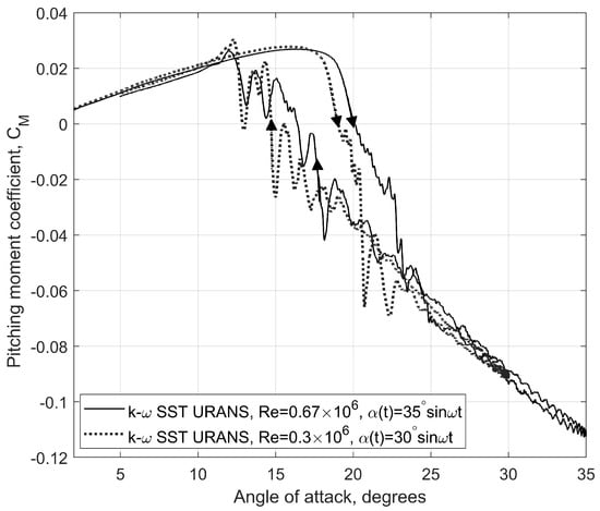 The pitching moment coefficients () obtained from the CFD URANS simulations by using OpenFOAM for two different flow Reynolds numbers are illustrated in Figure 5. Similar to the normal force coefficient (), the obtained CFD results demonstrated noticeable static hysteresis in the pitching moment coefficient () in both cases, i.e., and .