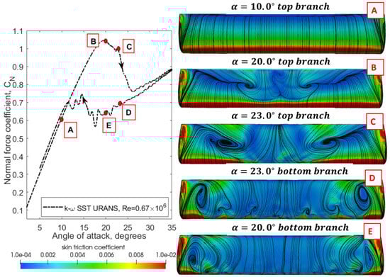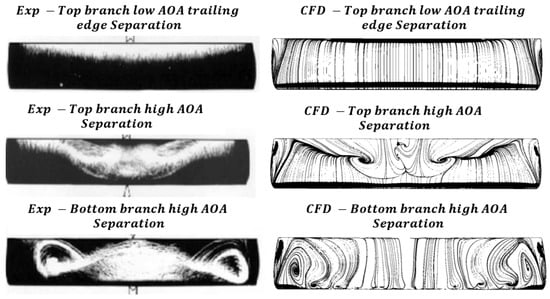 Flow visualization in wind tunnel using the oil flow images during static hysteresis from [] shows qualitative agreement with computationally predicted flow patterns. This comparison, shown in Figure 8, gives some level of confidence in using URANS simulations for predicting such complex and nonlinear bifurcation phenomena.