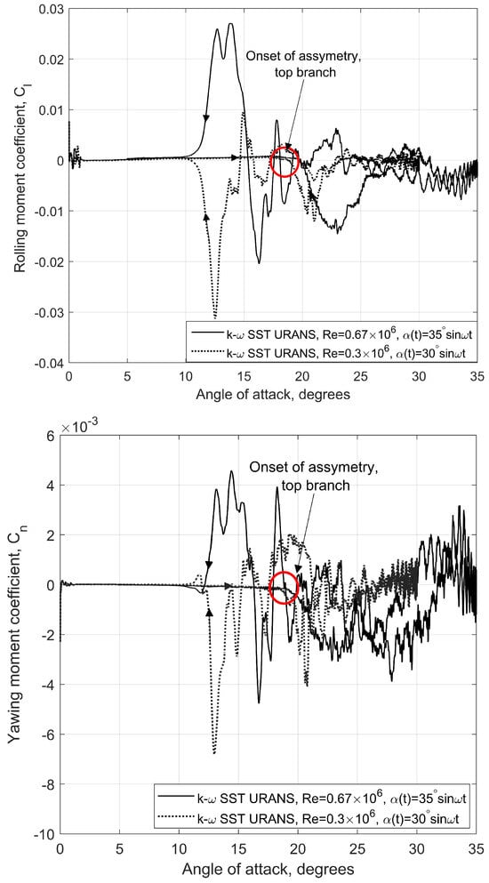 An important feature of high-angle-of-attack aerodynamics observed in experiments is the development of aerodynamic asymmetry []. The onset of aerodynamic asymmetry occurred in the conducted CFD simulations even with a perfectly symmetric grid. For the simulation carried out at , the onset and development of aerodynamic asymmetry was correlated with the presence of arch vortices on the top branch of static hysteresis and during reattachment flow transition from the bottom branch of static hysteresis. In order to estimate the maximum asymmetry from the CFD simulations, the rolling moment coefficient () and the yawing moment coefficient () were extracted from the CFD simulations and are shown in Figure 9.