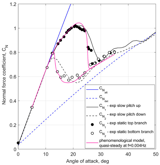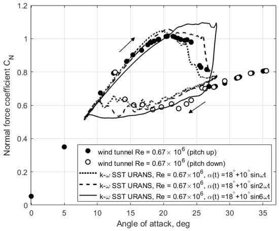 The effect of different rates of change in the angle of attack () on the normal force coefficient () around the static hysteresis region is presented in Figure 11. For this analysis, the angle of attack was changed periodically with the mean angle of attack of , amplitude of and three different frequencies (, and , where rad/s). The maximum rates of angle-of-attack change for the results presented in Figure 11 are deg/s (dotted line), deg/s (dashed line) and deg/s (solid line), respectively.